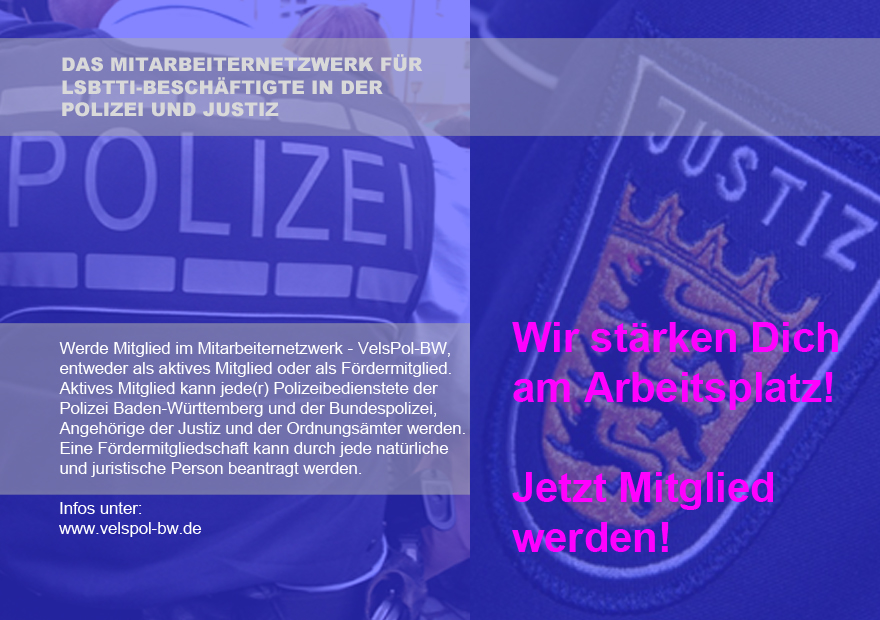 VelsPol-BW hat in den letzten Jahren immer wieder auf den Bedarf von Ansprechpersonen für LSBT-Beschäftigte hingewiesen und eine ausführliche Aufgaben- und Stellenbeschreibung für AgL bei der Polizei Baden-Württemberg vorgelegt.